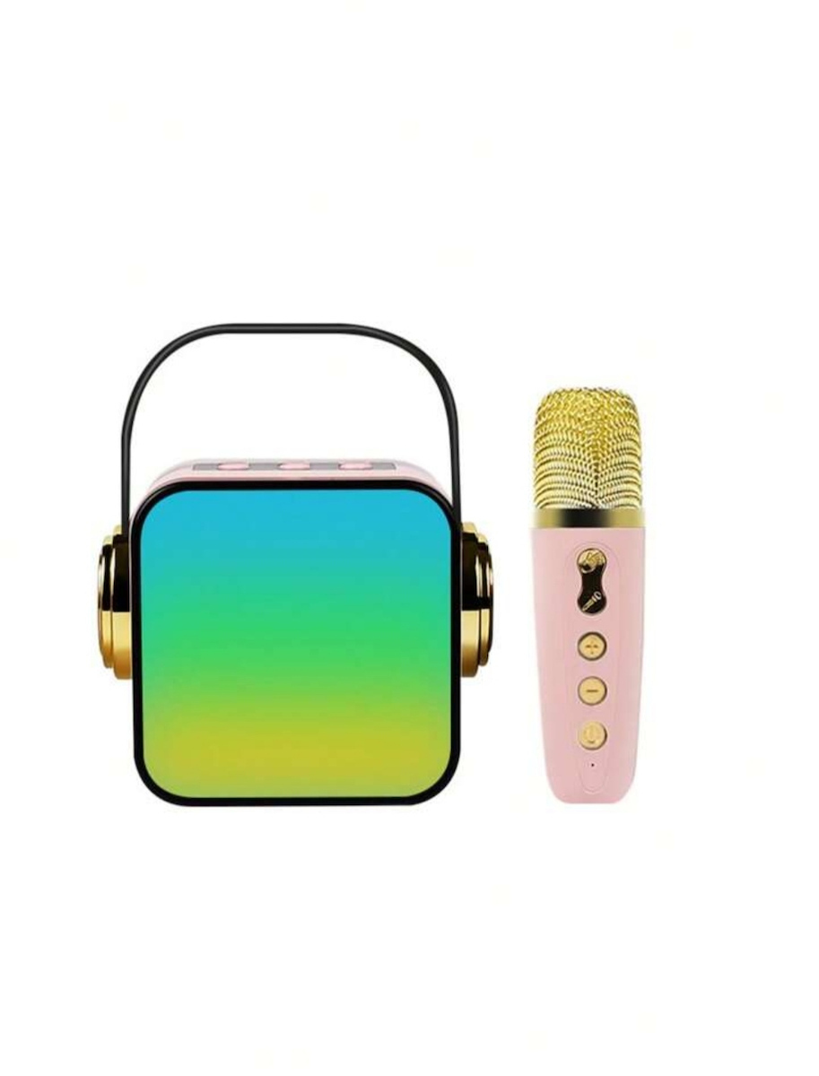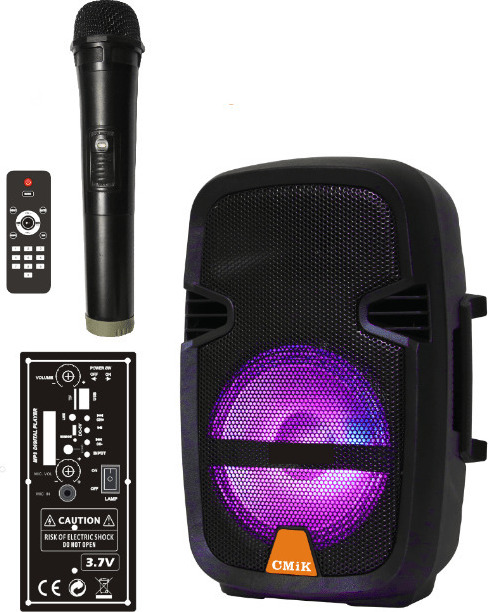Ένα ηχείο καραόκε με δύο ασύρματα μικρόφωνα με μπαταρία. Η ίδια η στήλη έχει επίσης ενσωματωμένη μπαταρία.